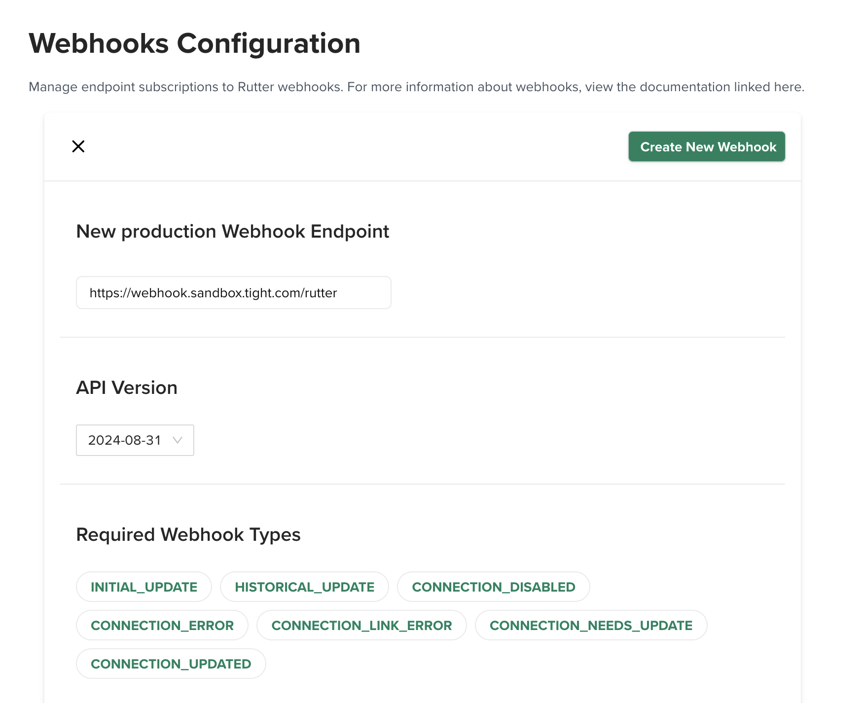 To configure webhooks, navigate to the Webhook Configuration section in your Rutter dashboard and add https://webhook.sandbox.tight.com/rutter as your webhook URL.