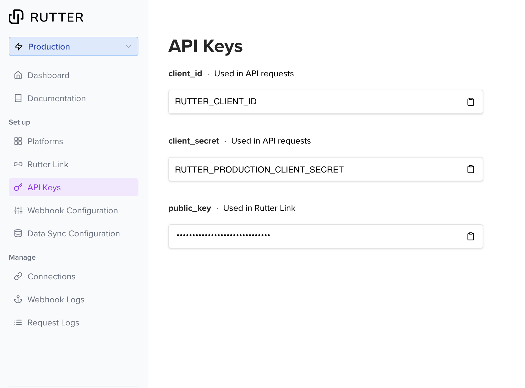 Ensure your production Rutter account has the same platform enablements and webhook configurations as your sandbox environment.