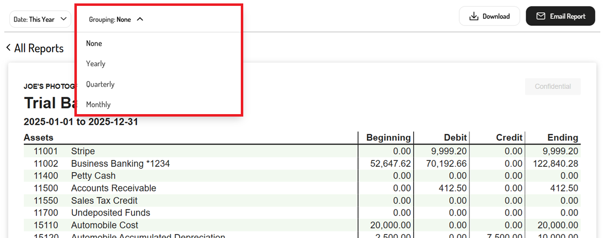 By default, the Trial Balance will show the data from this year without any grouping. The filters can be used to adjust the timeframe and grouping as needed.