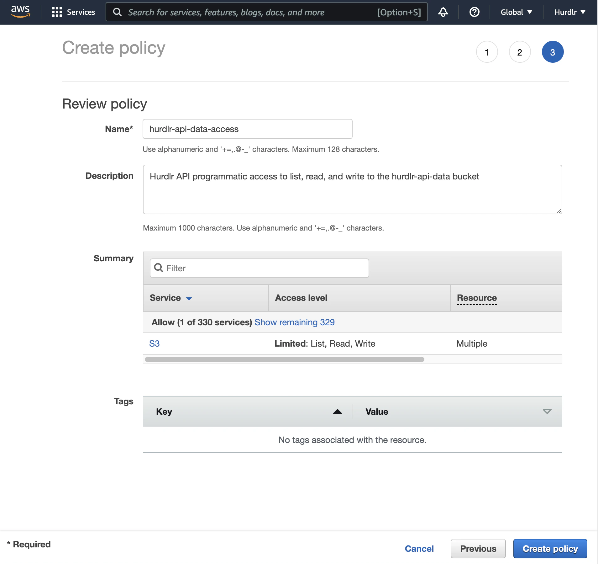 Name and Description. We recommend setting the Name to “hurdlr-api-data-access”.
