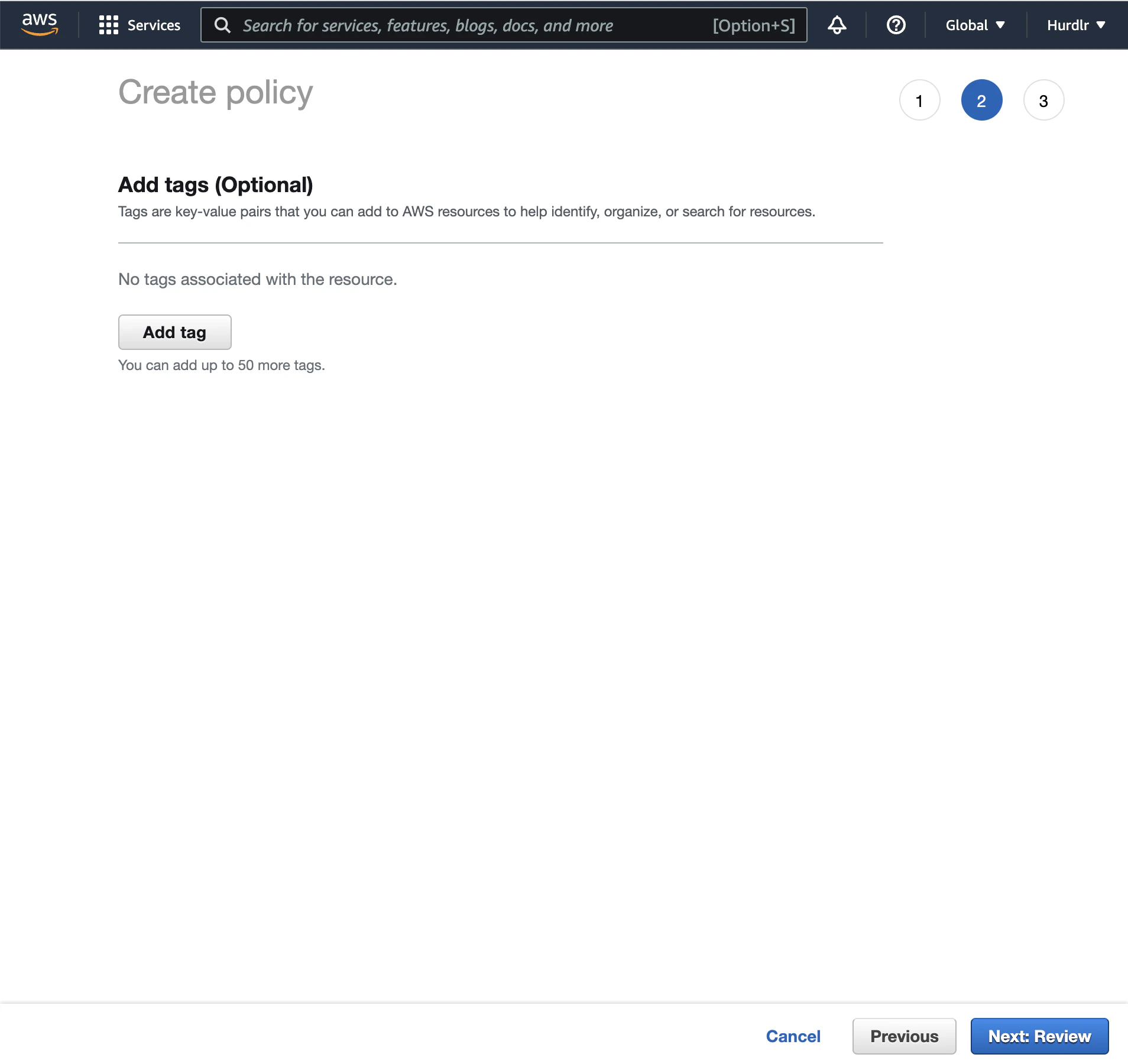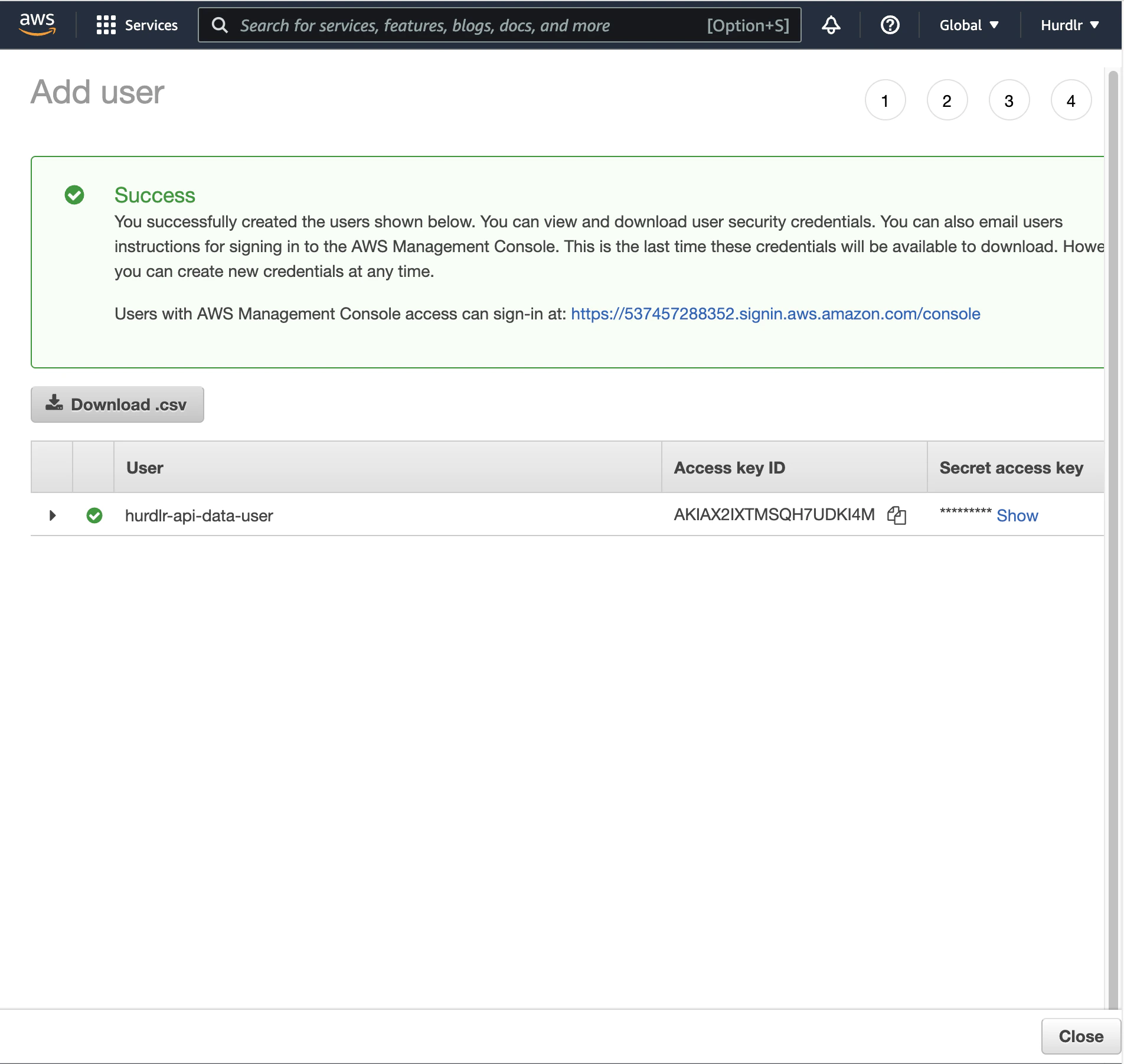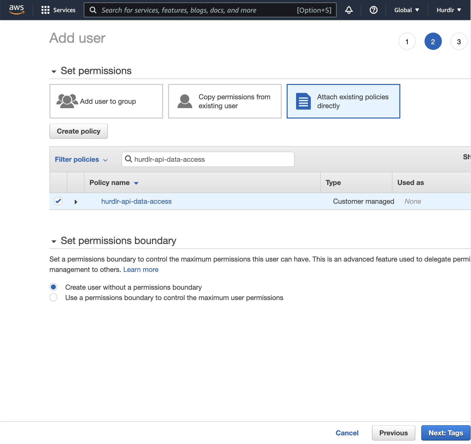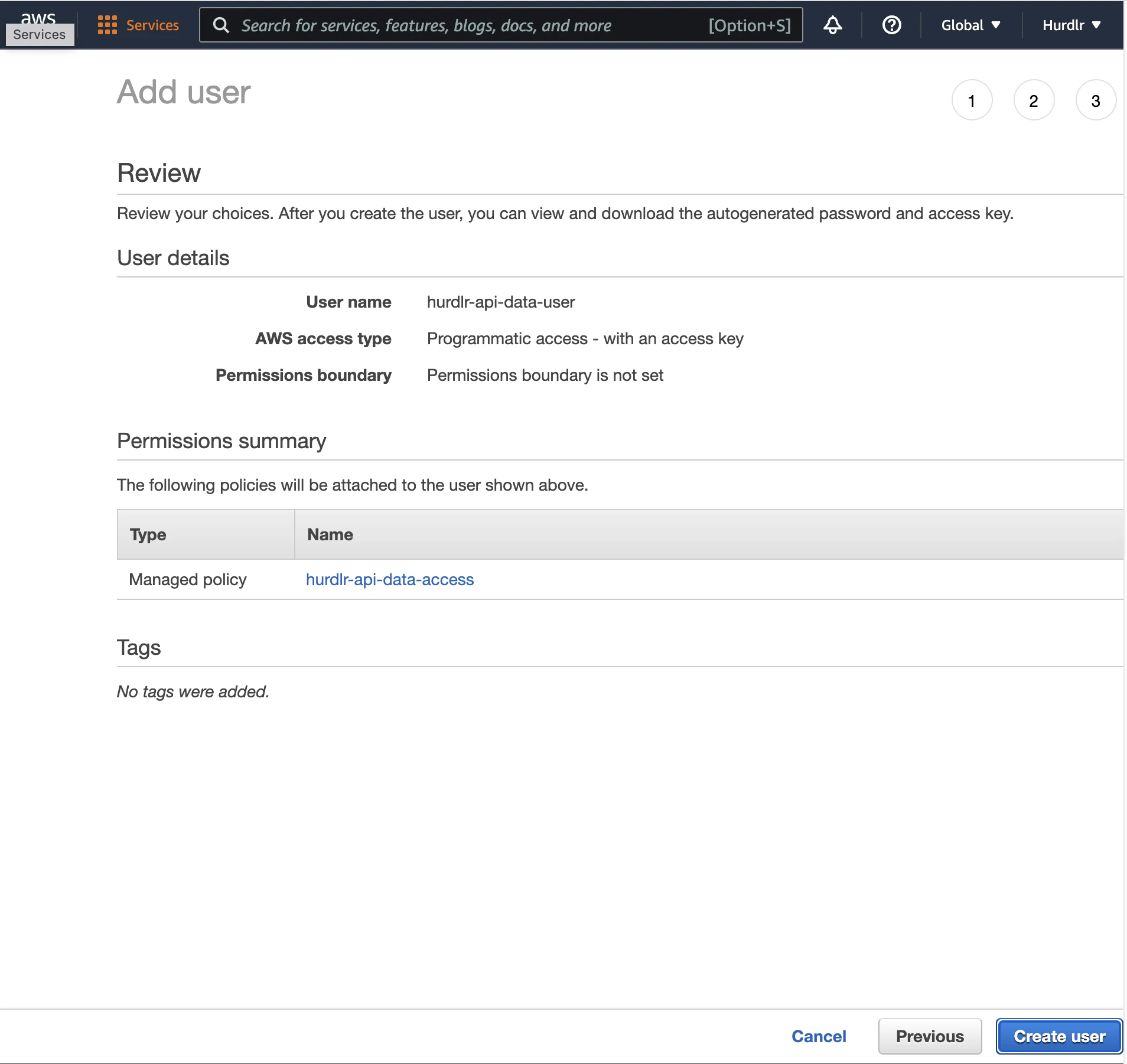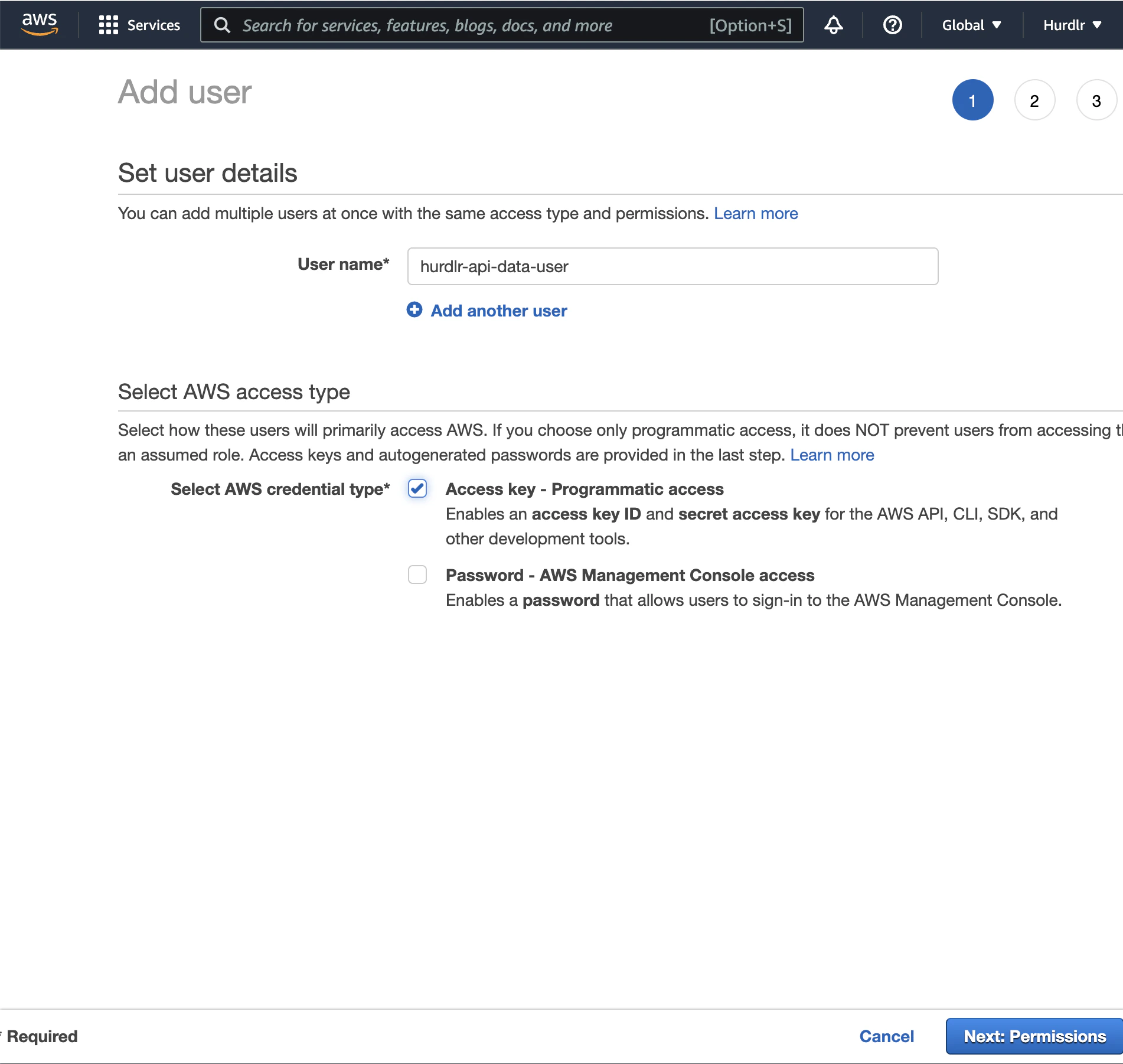 Next, you’ll need to add an IAM user using the new policy created in the prior step. The first step on the “Add user” flow will ask you to input aUser name, for which we recommend using “hurdlr-api-data-user”.