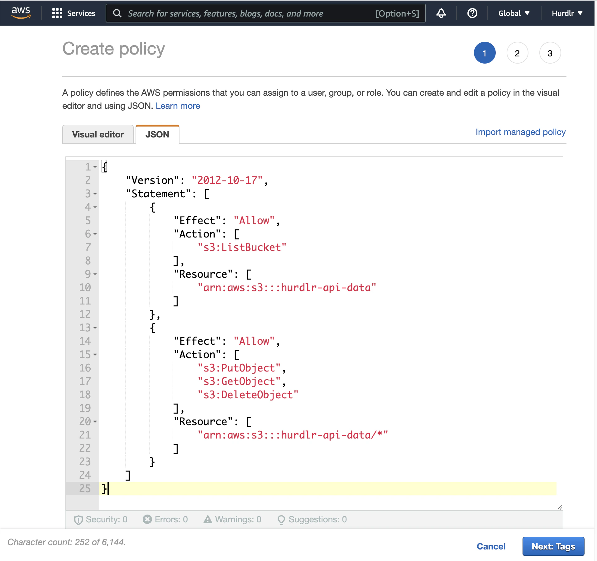Next, you’ll need to create an IAM policy to grant programmatic access to the Amazon S3 bucket that we created above. The first step on the “Create policy” flow will give you the option to use the Visual Editor or JSON. You should select the JSON option, and then paste the following JSON in there: