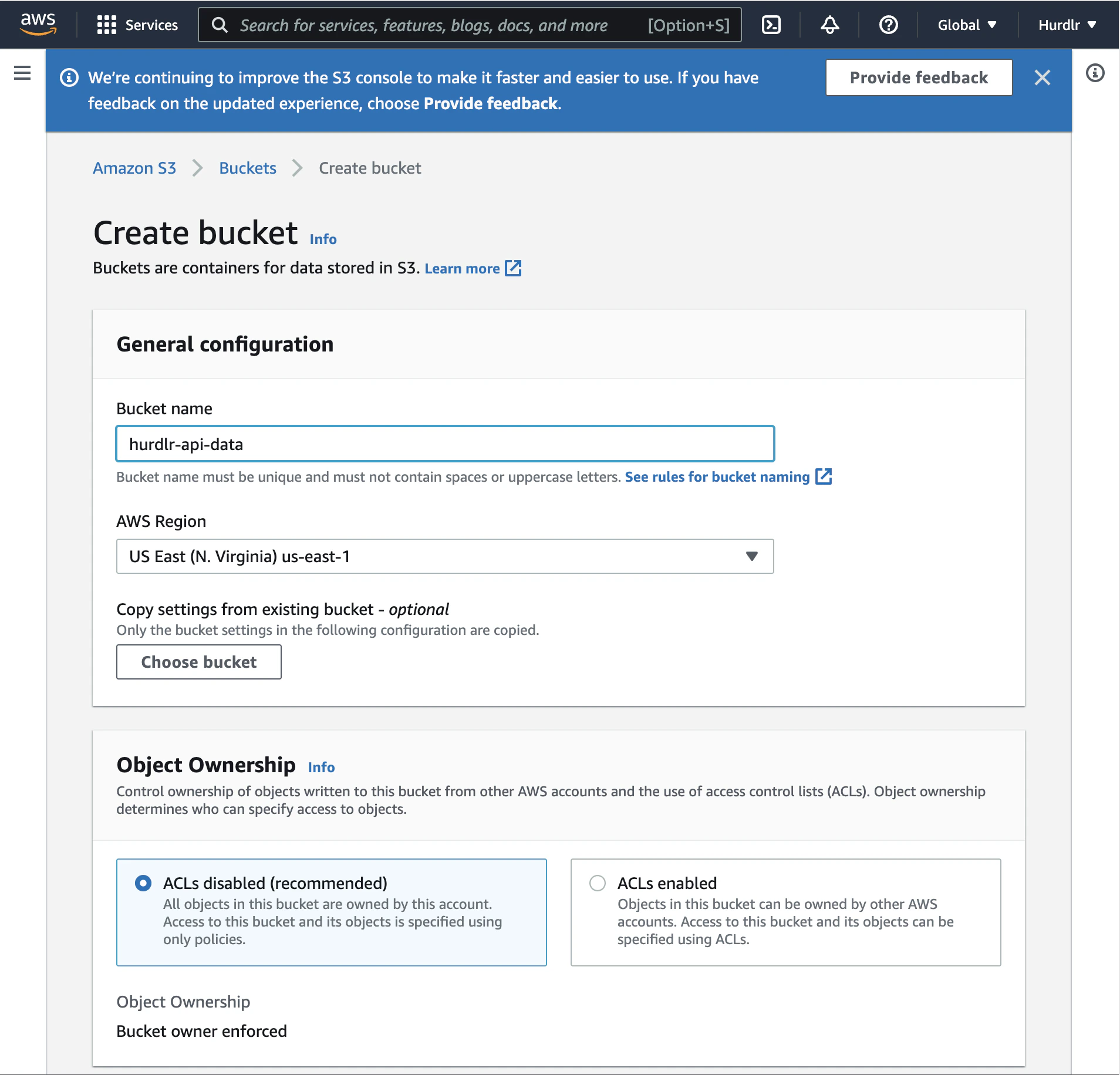 The first step to configuring your Tight API data lake is to create an Amazon S3 bucket to store Tight API data. You can name this bucket anything you’d like; “hurdlr-api-data” is used for the examples shown below.