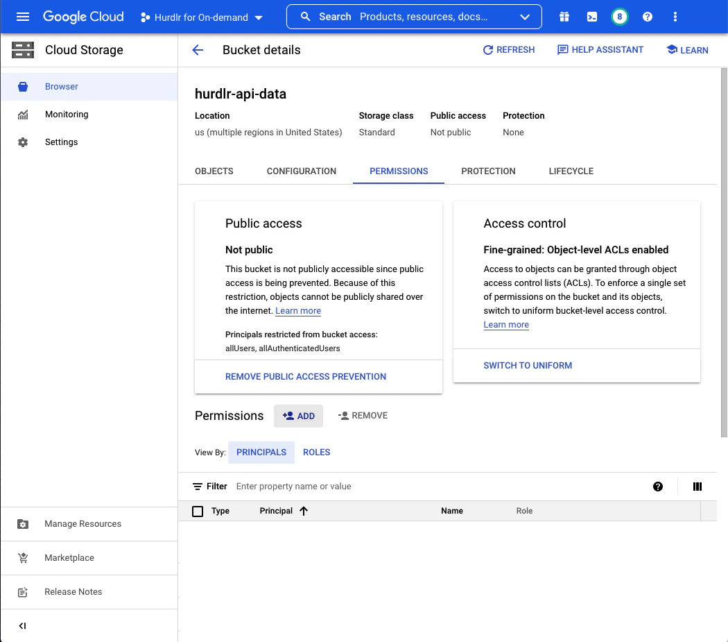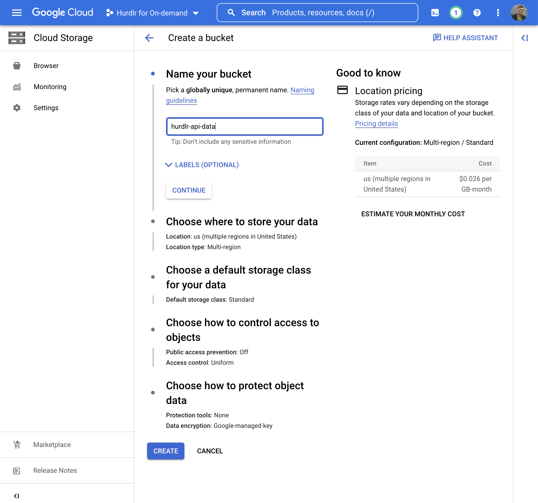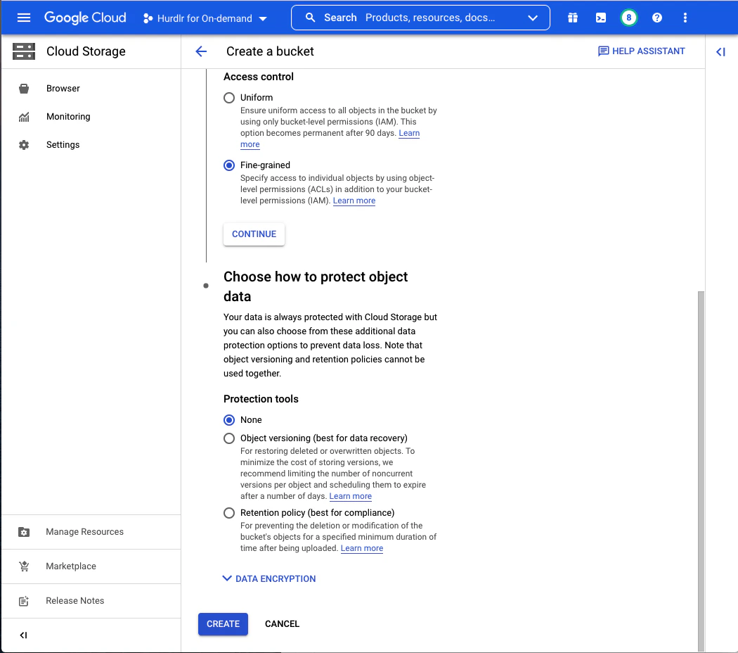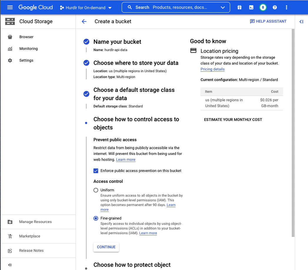 The next step to configuring your Tight API data lake is to create a Google Cloud Storage bucket to store Tight API data. We recommend naming this bucket “hurdlr-api-data”:
