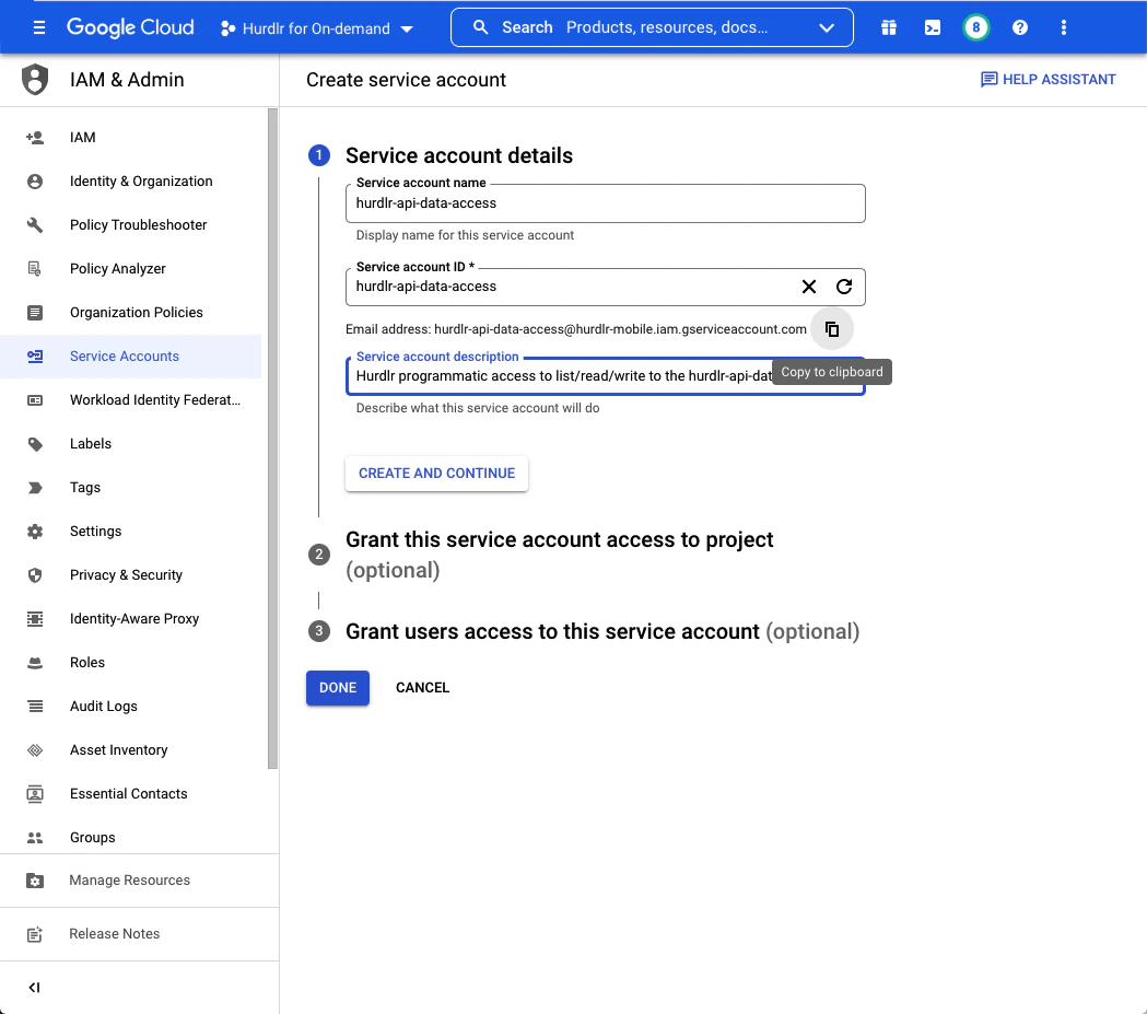 First, you’ll need to create a service account to grant programmatic access to the Google Cloud Storage bucket that we will create. The first step of the “Create service account” flow will require you to input aService account name and Description. We recommend setting the Service account name to “hurdlr-api-data-access”.