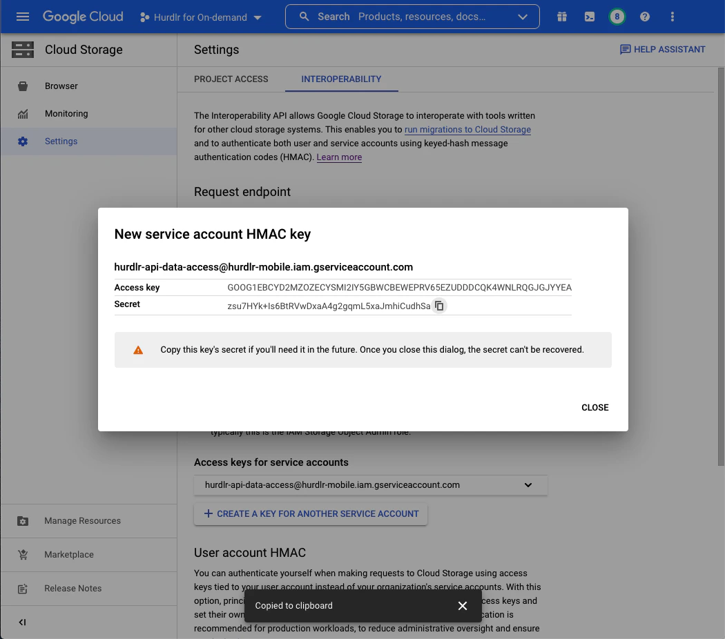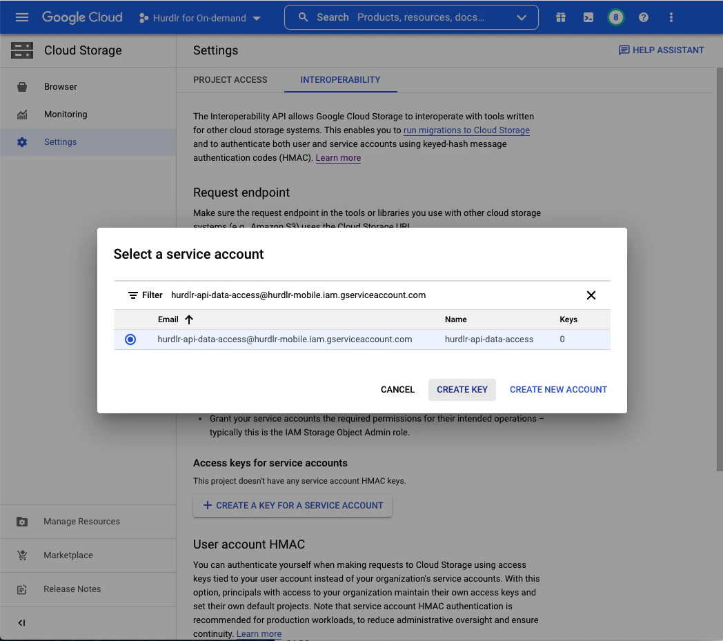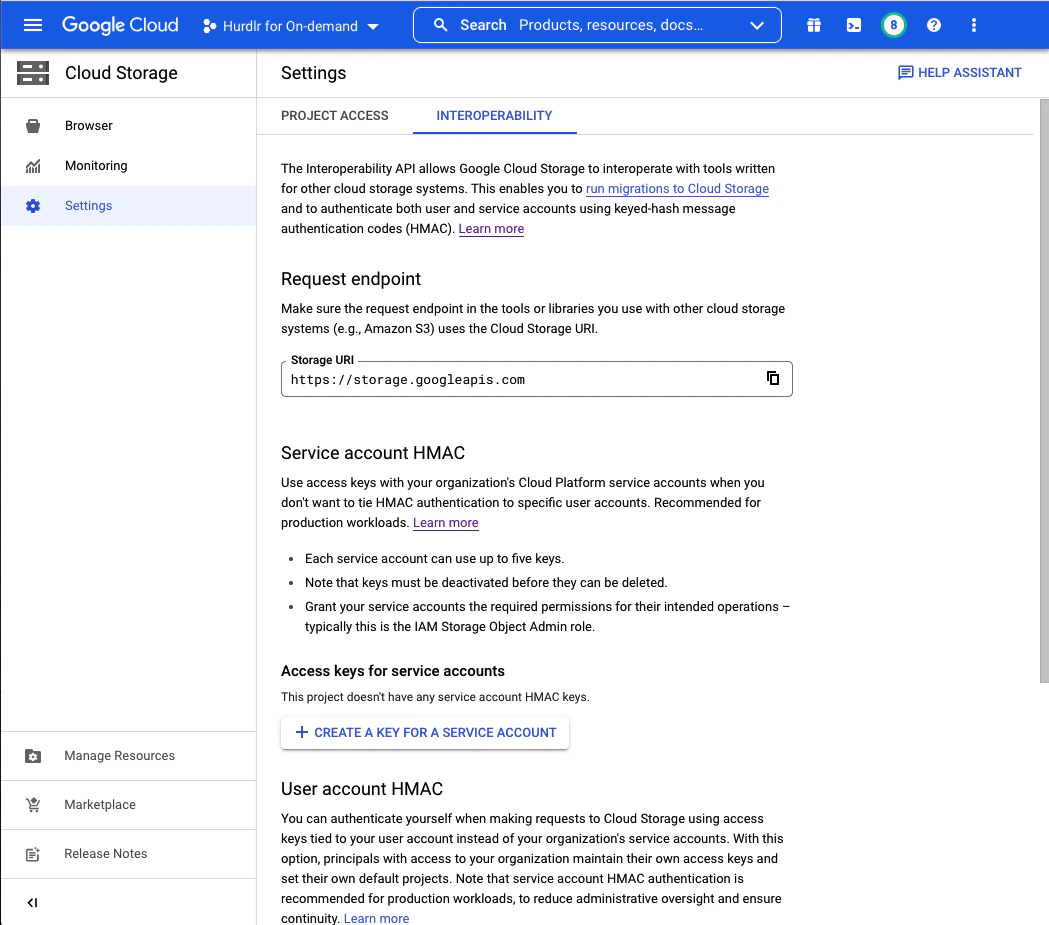 Next, you’ll need to create a service account HMAC key using the new service account created in Step 1. From the “Cloud Storage” screen, you should click on “Settings”, and then select the “Interoperability” tab:
