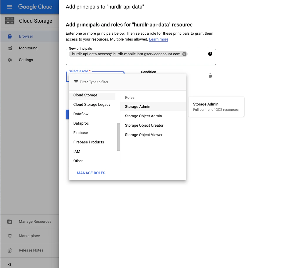 New Principals field, you can paste the email address that you copied to your clipboard in Step 1, and then set the Role to “Cloud Storage: Storage Object Admin”: